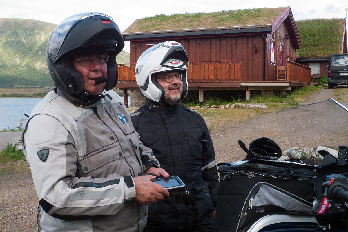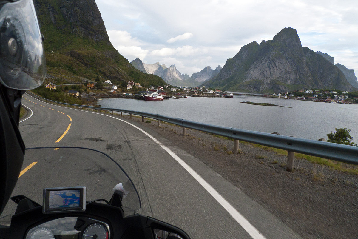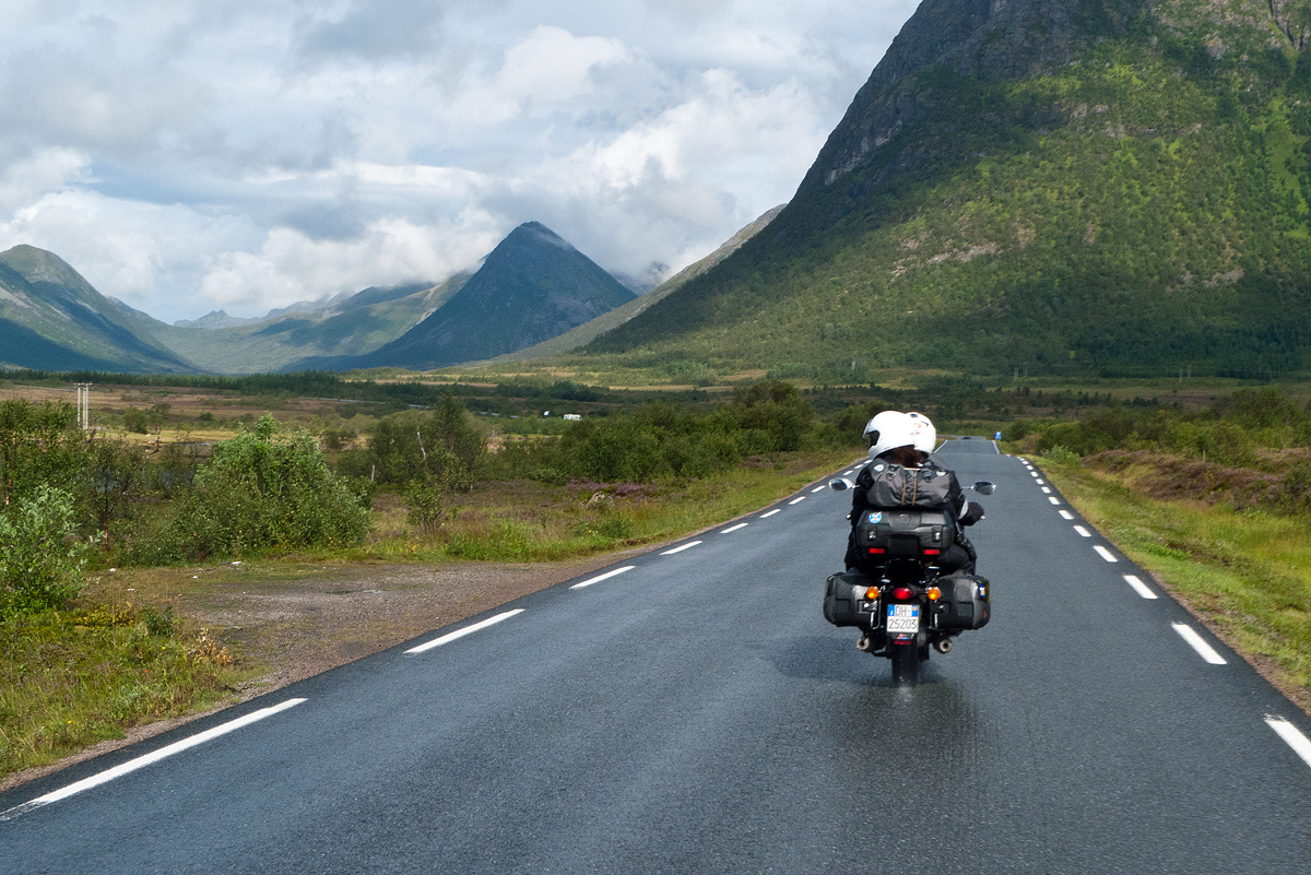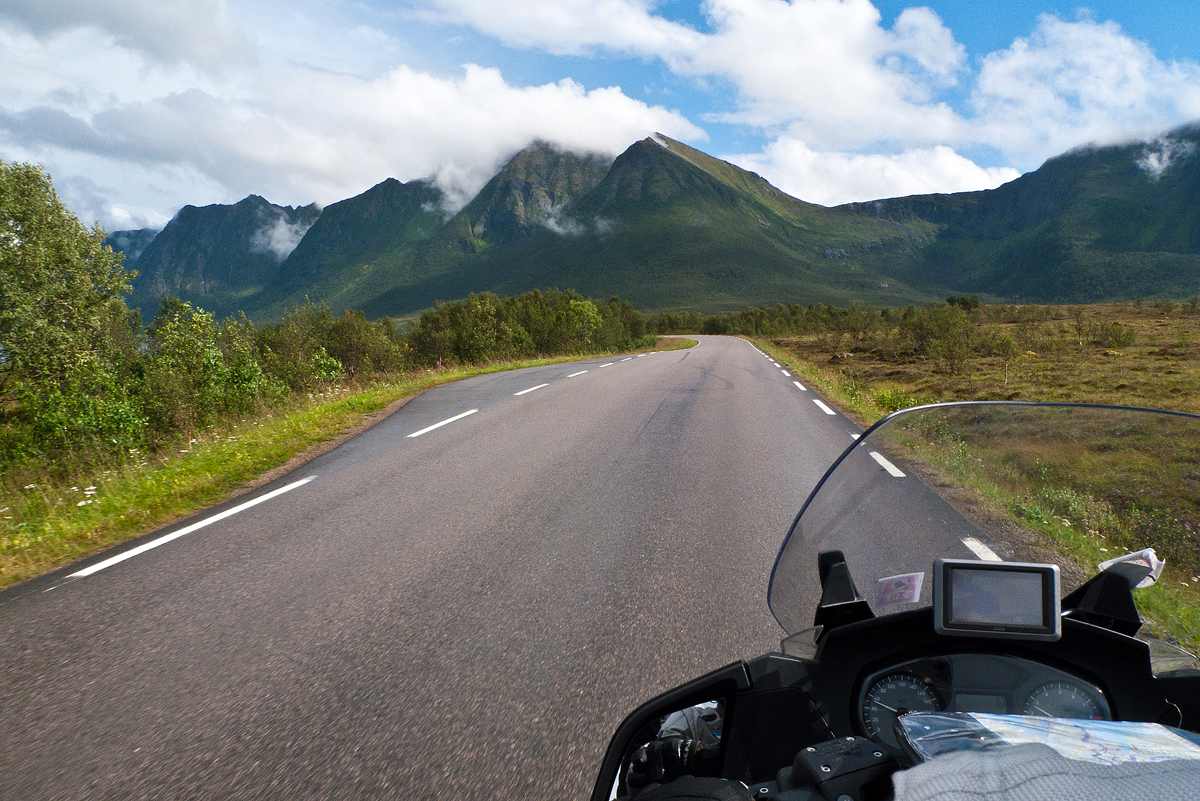 Giunti a Strand, sull’isola di Hinnøya, il cielo si apre e percorriamo il lungo fiordo che la divide dalle isole vicine con un entusiasmo crescente per l’ambiente che ci appare e i colori del paesaggio. C’è tempo anche per una sosta in un ristorante di campagna in cui piombiamo con l’indole un po’ chiassosa dei motociclisti mediterranei suscitando un momento di sconcerto e di bonaria curiosità nei clienti. La zuppa di carne di renna è squisita, come pure il pane fatto in casa. Sarei tentato dai monumentali dessert che vedo passare, ma mi trattengo.