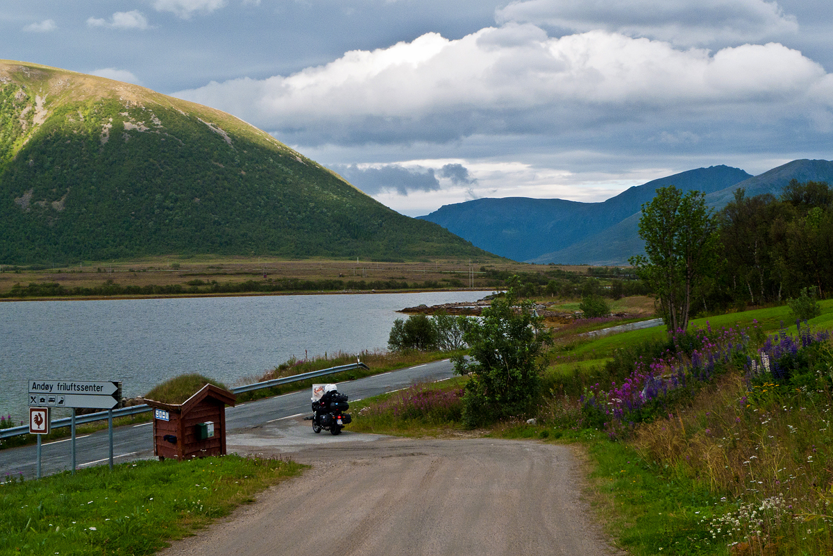 Andøya è lunga, stretta e piatta, ad eccezione del fianco occidentale e dunque, passati con l’ennesimo ponte sull’isola, scegliamo la panoramica strada occidentale, ma purtroppo il tempo si guasta nuovamente e ci impedisce di avere una visione completa delle montagne che tornano a farsi aguzze e a scendere a precipizio nel mare. Arriviamo ad Andenes che il tempo sta nuovamente migliorando.