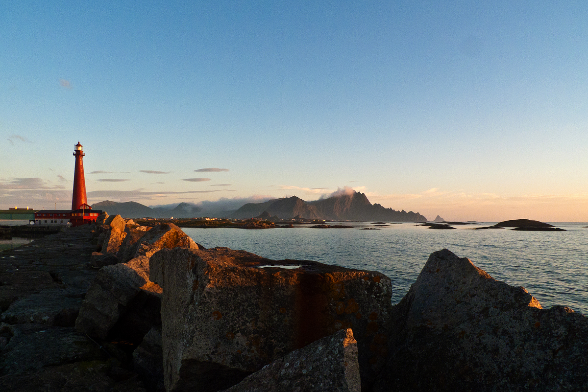 Superato il ponte che unisce Moskenes a Vestvågøya, a Leknes deviamo dalla E10 sulla 817, una piccola strada che costeggia la parte meridionale dell’isola in un ambiente bucolico e apparentemente dimenticato dalla storia. Su di noi incombe la mole imponente del Monte Blåtinden e la sottile striscia di terra fra la montagna e il mare è contesa dalla strada, groppi di case e piccoli greggi che stazionano oziosi. Poco dopo Valberg, un cartello sulla destra all’imbocco di una strada bianca indica una hytte in affitto. La stradina percorre un breve promontorio e arriva a un prato con due villette bianche, un capannone in legno e un piccolissimo punto di approdo fra le rocce. Se si ha la fortuna di trovare libera una delle due villette, l’esperienza del soggiorno è esclusiva: nessuno intorno, la costa frastagliata da un lato e la montagna scura dall’altro, i racconti di pesca del padrone della hytte che vi mostrerà anche il magazzino dove secca per il suo uso personale i merluzzi.
