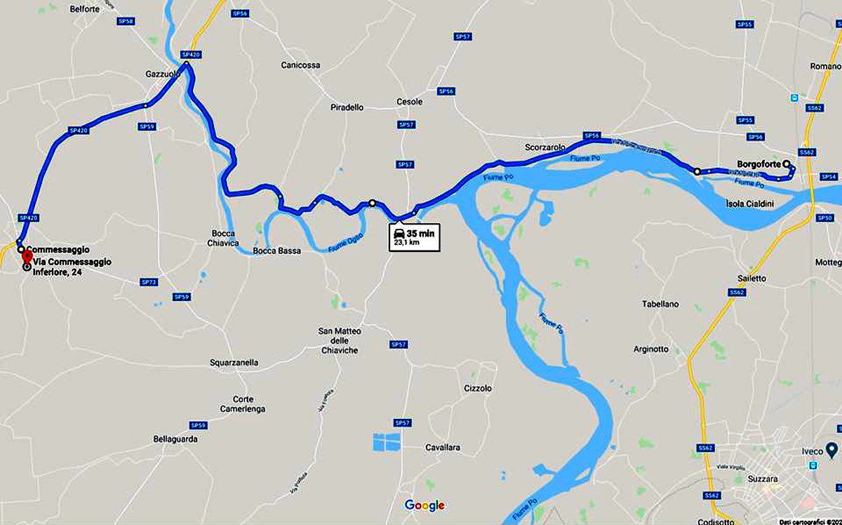 La strada arginale continua fino all’incrocio con la statale 420, all’altezza di Gazzuolo. Lì termina l’incantesimo e ci si ritrova catapultati nell’ambiente banalizzato dalla modernizzazione. Svoltando a sinistra, qualche chilometro più avanti, si ritrova un altro angolo molto suggestivo sull’altro ponte di barche che unisce i comuni di Commessaggio e di Sabbioneta. L’attuale ponte risale al 1976, anno in cui fu demolito il ponte vespasiano che era stato costruito nel 1583. Di fronte al ponte, il massiccio Torrazzo di Vespasiano del XVI secolo intorno al quale stormi di colombe compiono le loro evoluzioni a ranghi serrati.