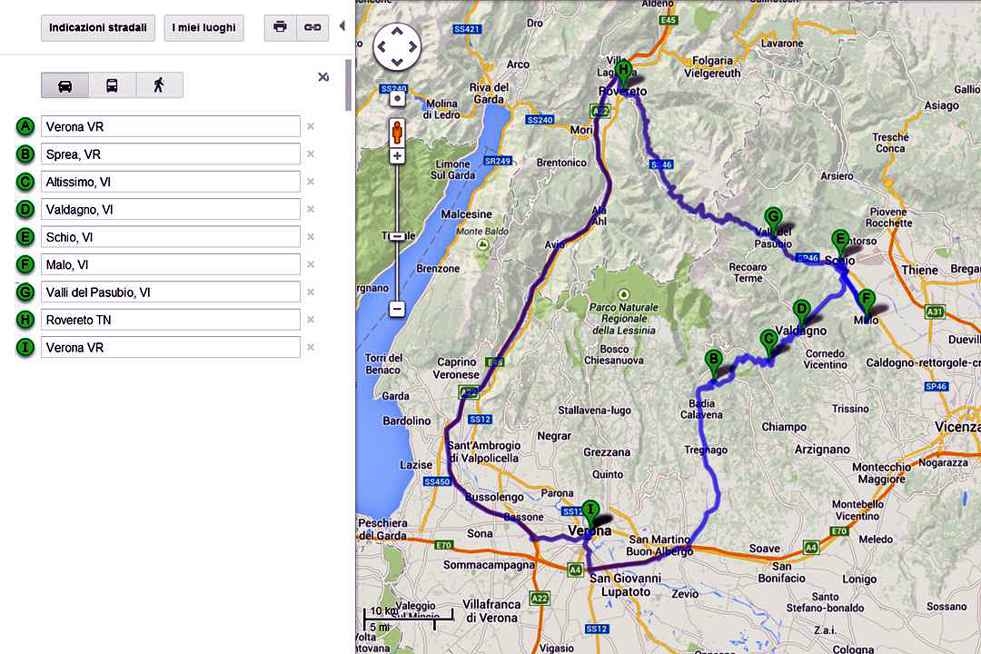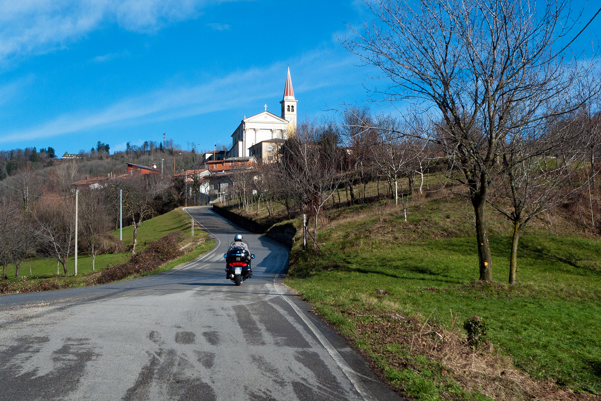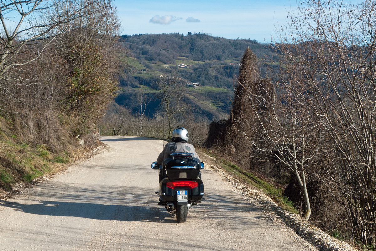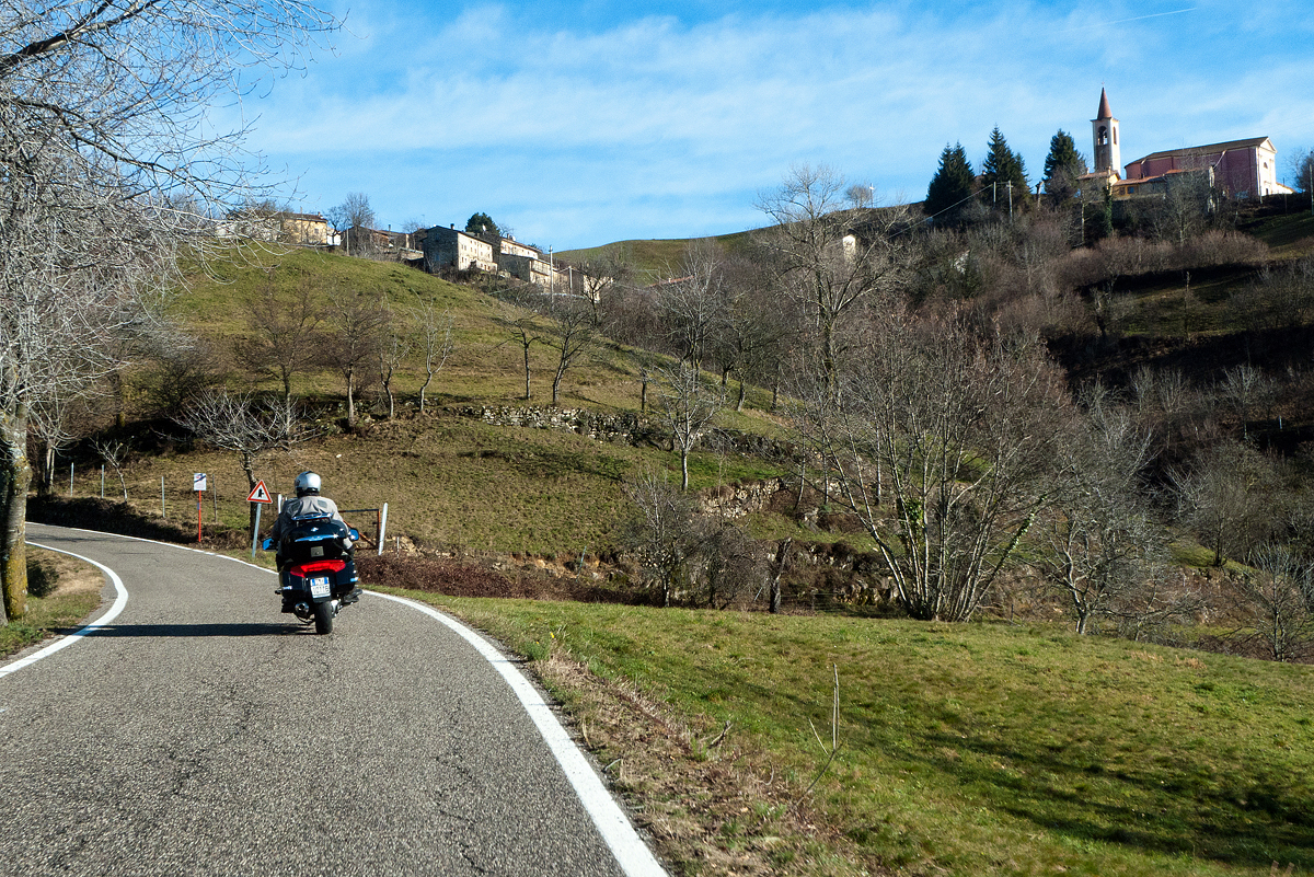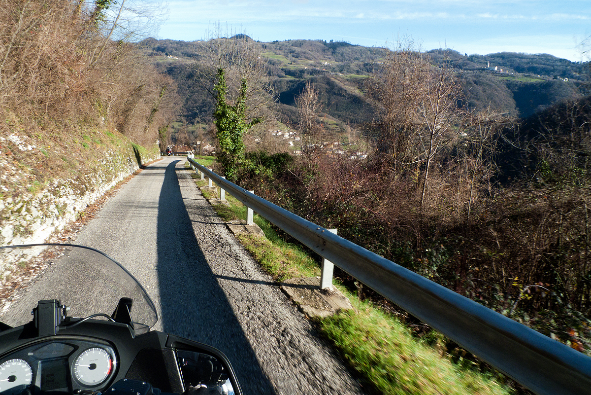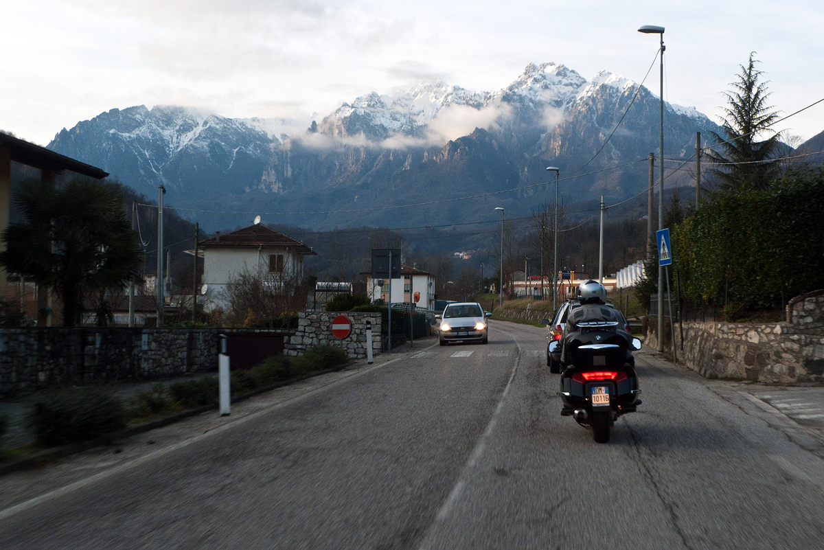 A Gennaio le giornate sono corte e, appena mangiato uno splendido baccalà alla Trattoria Dalla Valentina, è già ora di tornare a casa. Rifare le montagne russe dell’andata neanche parlarne; scendere a Vicenza e fare la pianura verso Verona, no, ci rovinerebbe la poesia di una buona giornata. Abbiamo ancora si e no un paio di ore di luce, abbastanza per salire a Valli del Pasubio, Pian delle Fugazze e giù in Vallarsa a Rovereto. In alto, chiazze di neve sporca ci mettono sul chi va là, ma basta un po’ di attenzione. Quando arriviamo in Val Lagarina, è quasi buio, ma ora il pericolo del ghiaccio l’abbiamo lasciato alle spalle e possiamo correre rilassati verso casa.