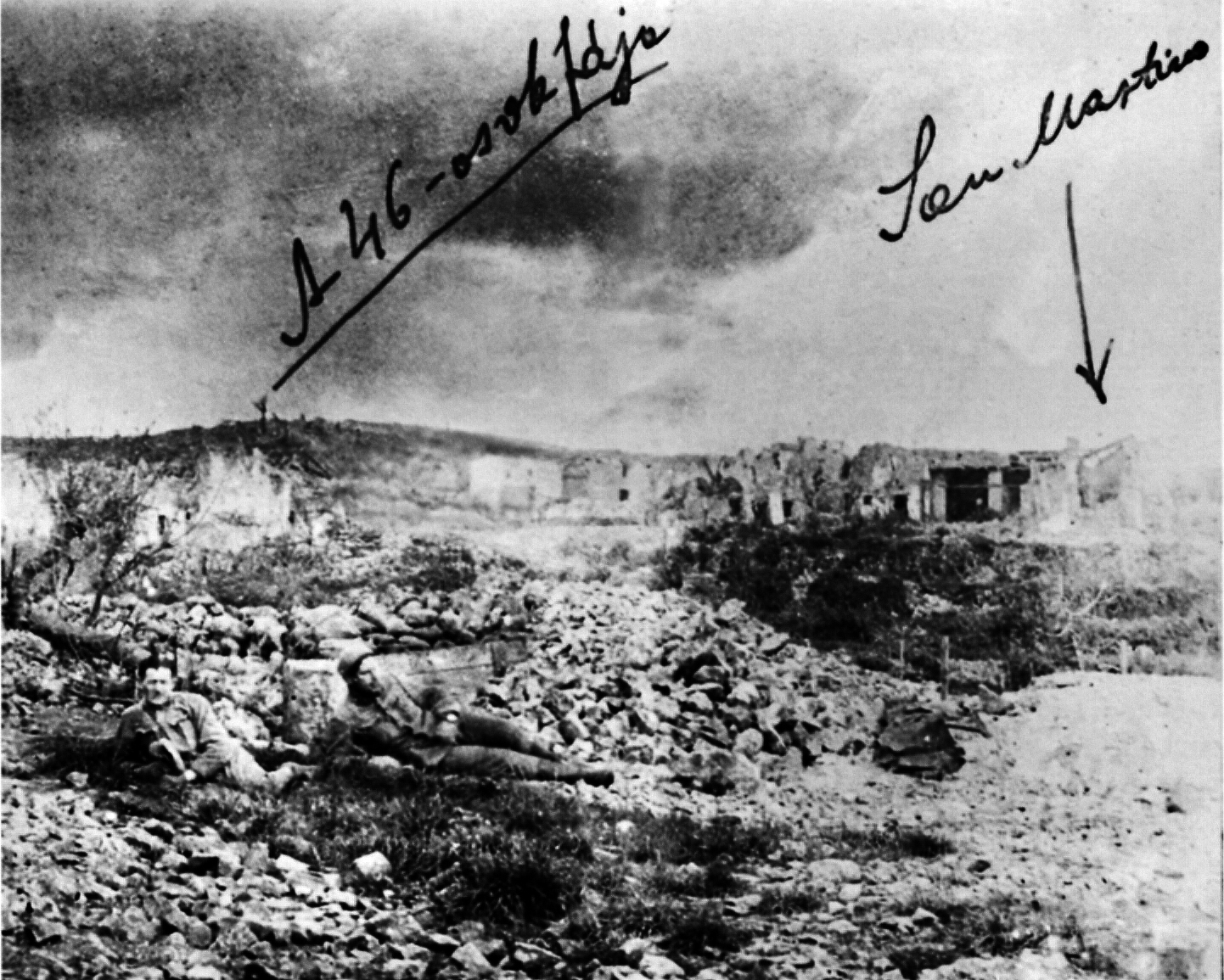 Qualche giorno dopo László Kókai, soldato del reggimento, annotava a sua volta: “Non si può esattamente specificare dove sono le rovine della chiesa, tanto le rovine sono travolte dalla pioggia delle granate italiane, non si distinguono dalle pietre biancheggianti, prive di vegetazione. Davanti alla chiesa l’albero secco, che sta ancora in piedi, ci indica dove doveva sorgere l’enorme santuario del paese di San Martino del Carso. Sull’intero altopiano di Doberdò, sul monte sassoso rasato immacolato, sulle rovine di San Martino, sulla collina della chiesa, sul monte San Michele non c’è più vita, non si vedono piante, steli d’erba e alberi vivi. Sulla collina della chiesa solamente quell’albero troncato, privo di vita, testimonia che una volta qui c’era vegetazione. Con il suo tronco paralizzato l’albero nereggia come un punto esclamativo sul campo di battaglia raso dalla pioggia delle granate.”