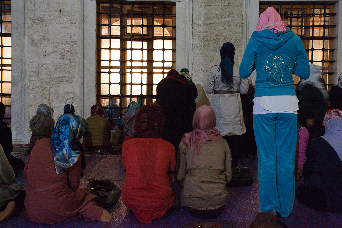 Immagino i fedeli, spalla contro spalla, sollevare le mani alle orecchie pronunciando formule che non conosco; abbassare le braccia e mettere la destra sopra la sinistra immediatamente al di sotto dell’ombelico per lodare DIO, abbassando la testa ad angolo retto e appoggiando le palme delle mani sulle ginocchia. Fra poco sarà il momento del sujud, ma sono distolto dal sorriso di una ragazza con il hijab che ci porge una grande scatola di lokum. Esito incerto e alla fine ne scelgo uno sul quale svetta una mandorla pelata. Spero che l’inchino di ringraziamento abbia almeno un po’ la grazia del suo gesto.