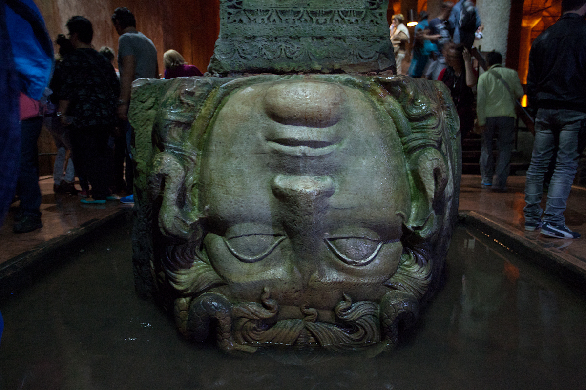 Due delle trecentotrentasei colonne che sostengono il soffitto della cisterna basilica di Giustiniano, sono appoggiate su blocchi di marmo che rappresentano la medusa. In uno dei due, la medusa poggia sulla guancia destra e nell’altro è a testa in giù.