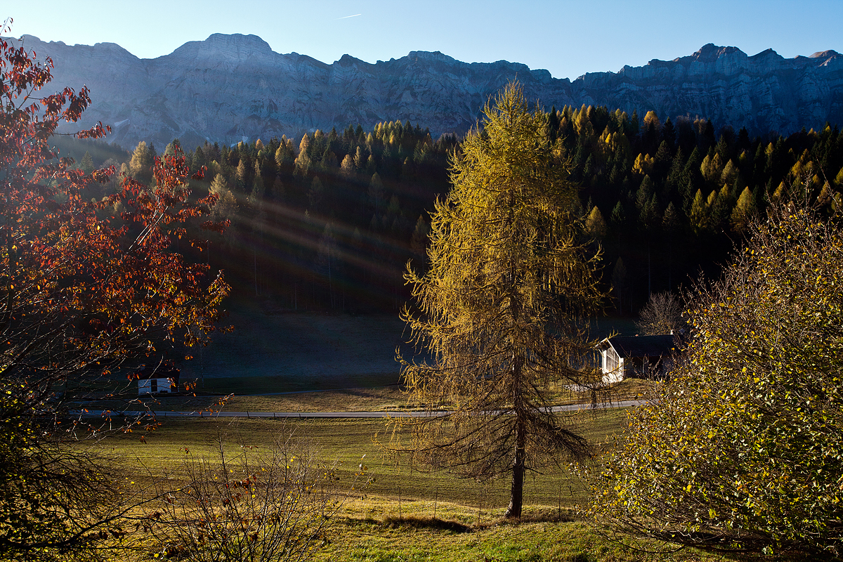 Mentre scendo l’ultimo breve strappo prima del rifugio, il sole fa capolino fra Col San Pietro e Monte Neva e accende di fiamme dorate le cime dei larici. Fra poco il sole illuminerà anche il prato, scioglierà la brina che lo imbianca e dissiperà i vapori della notte che fluttuano bassi, laggiù dove le ombre sono più scure. Mi siedo sull’erba indifferente alla guazza gelata. Lontano il motore di un’auto che forse sale, il tonfo sommesso di una finestra, il rintocco fesso di campanacci che escono al pascolo. Passi crepitano decisi sulla ghiaia, una portiera sbatte, il motorino d’avviamento gratta un po’, anche il cambio è rumoroso. L’umidità sale impietosa lungo la schiena e ho freddo, ma poco importa. Il ricordo corre a un’altra alba, ad altre montagne che non conoscono la verticalità della dolomia, a tronchi lisci di abete bianco, al bramito del cervo in amore. Chiudo gli occhi e quando li riapro è giorno fatto: il prato è un mare di perle d’acqua, scintillanti fra gli steli dell’erba, e il bosco una tavolozza di oro e smalti rossi e verdi. Senza cercarle, mi ritrovo sulle labbra le parole di Luca evangelista: “per cui verrà a visitarci dall’alto un sole che sorge, per rischiarare quelli che stanno nelle tenebre e nell’ombra della morte”.