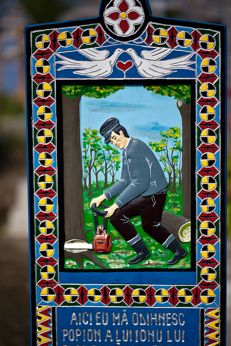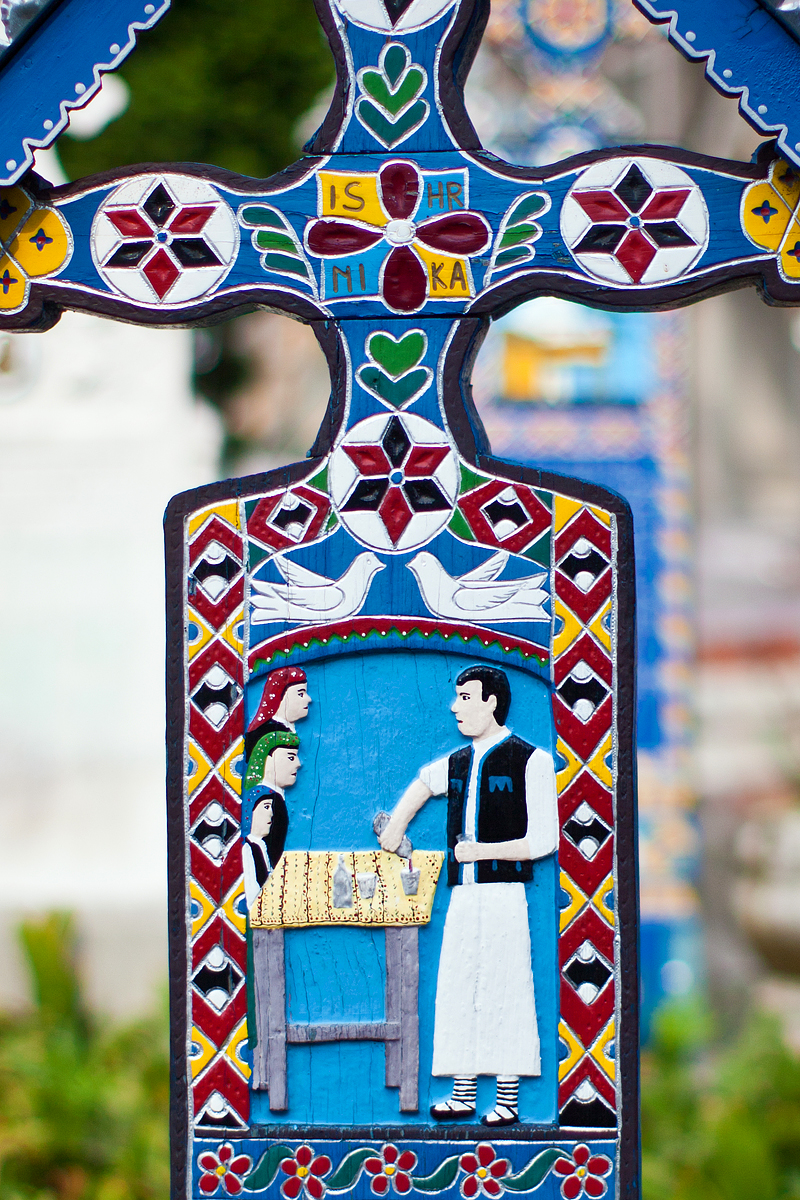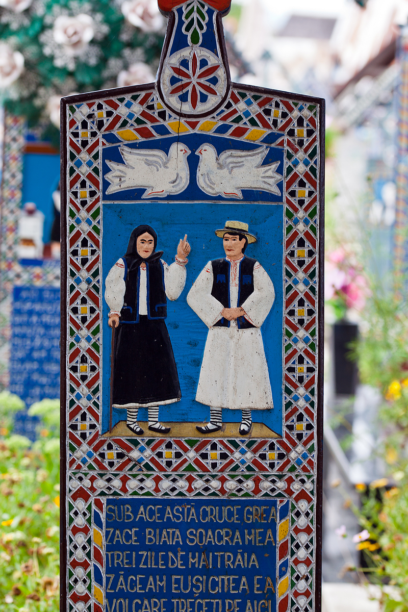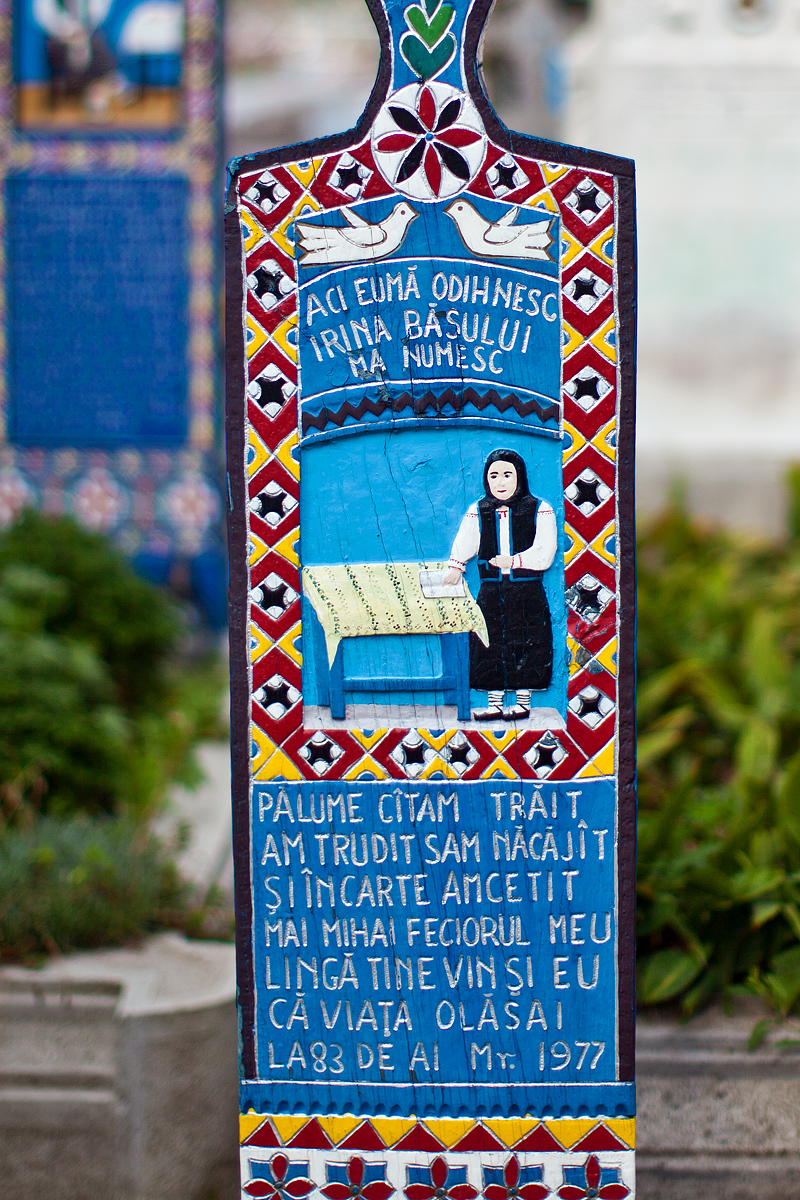 Noi siamo arrivati presto e abbiamo atteso che il cancello venisse aperto, voltando le pagine dell’ottimo libro di Bruno Mazzoni che ha tradotto gran parte delle iscrizioni parlanti del cimitero. Consiglio il libro a chiunque voglia visitare il cimitero, anche se è difficile da trovare. Senza di esso, dopo un po’ le grandi croci tombali, intagliate con motivi geometrici e floreali e dipinte a colori vivaci, scorrono via come quadri di una mostra. Sono suggestive le croci del “cimitero allegro”, anche se non comprendi le parole fittamente incise ed evidenziate con la biacca. Intuisci un culto della memoria diverso da quello a cui siamo abituati a casa nostra che confina il defunto al proprio nome, alla sua data di nascita, a quella della morte e al lutto dei familiari. Lo intuisci guardando la vignetta in bassorilievo, presente in tutte le croci, che raffigura il defunto nelle sue attività quotidiane, o nelle circostanze della sua morte o, ancora, per il carattere e le passioni che il villaggio gli attribuiva. Tuttavia, solo la lettura del testo delle epigrafi ti consente quel minimo di comprensione utile per andare al di là della caricatura e avvicinarti a storie di vita che dicono qualcosa a chiunque. Adesso ne rileggo alcune a Maria Grazia che sorseggia la sua Coca Cola.