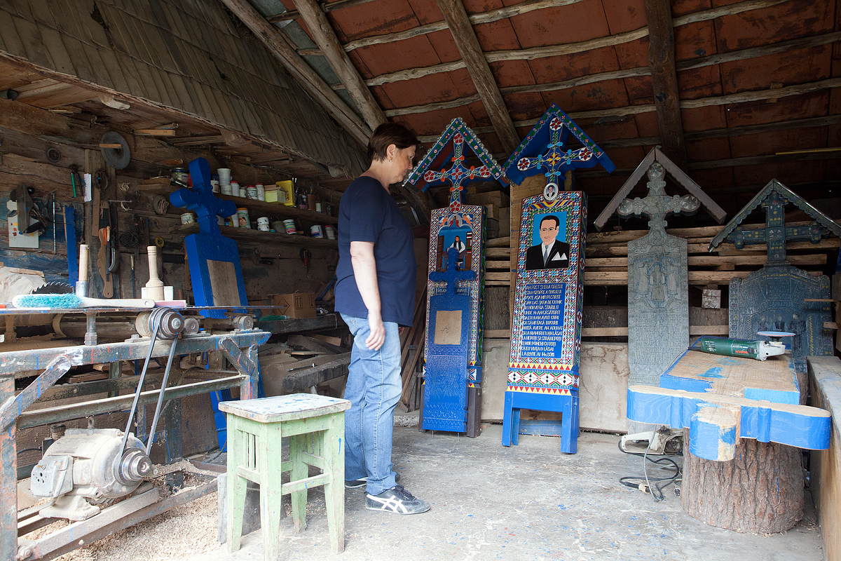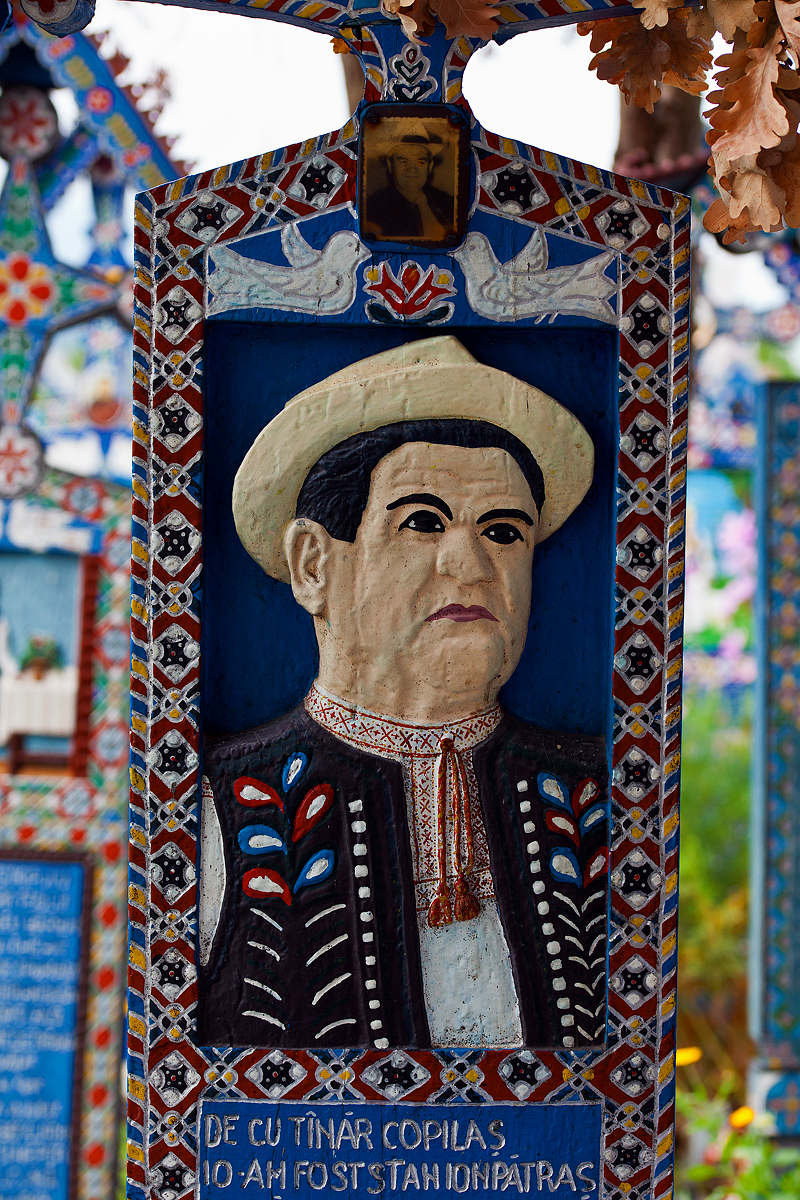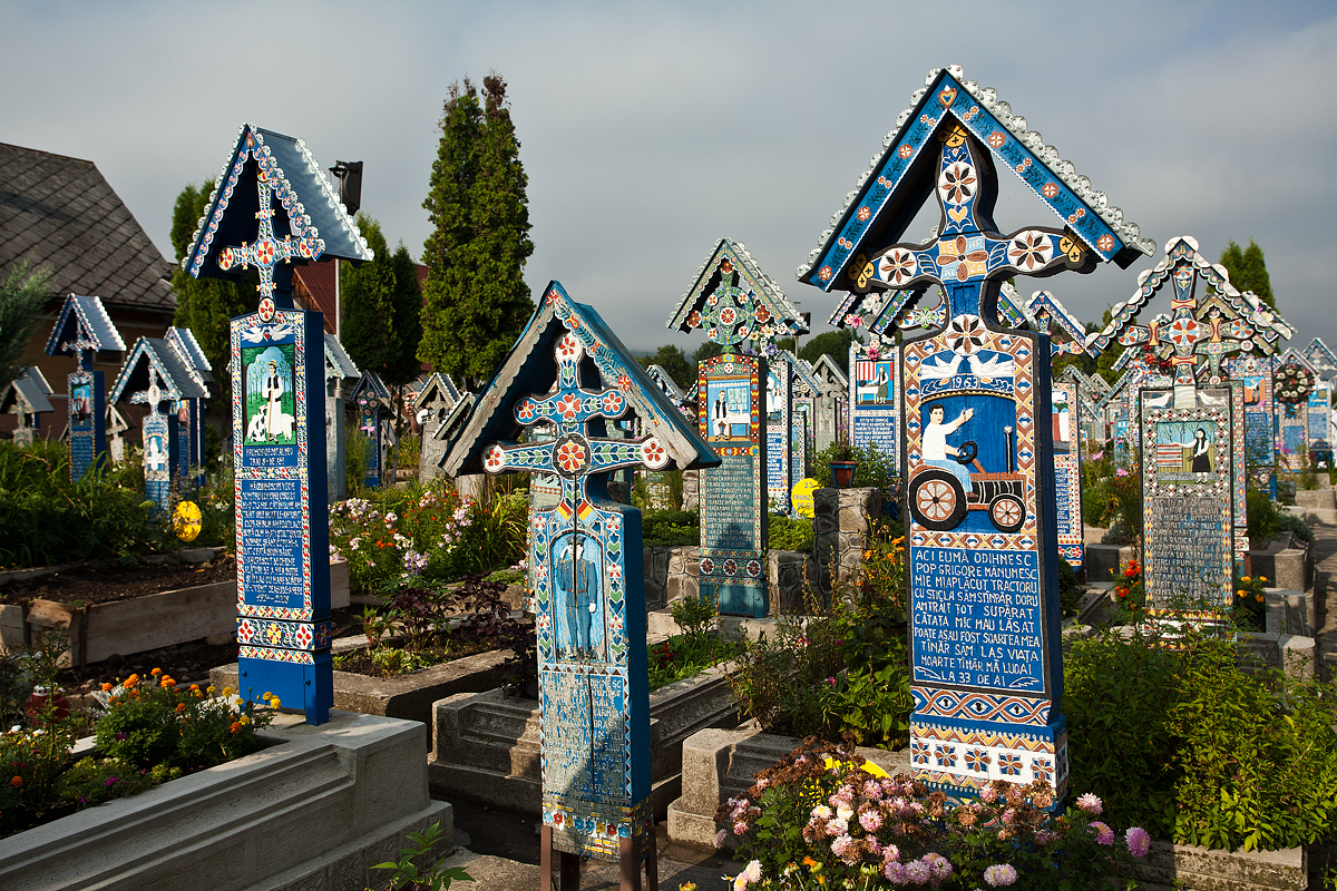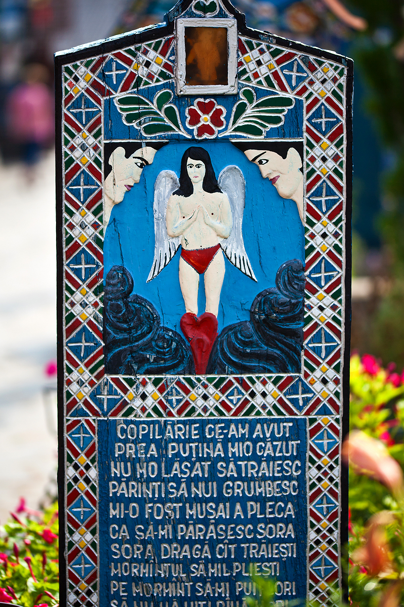 Noi siamo arrivati presto e abbiamo atteso che il cancello venisse aperto, voltando le pagine dell’ottimo libro di Bruno Mazzoni che ha tradotto gran parte delle iscrizioni parlanti del cimitero. Consiglio il libro a chiunque voglia visitare il cimitero, anche se è difficile da trovare. Senza di esso, dopo un po’ le grandi croci tombali, intagliate con motivi geometrici e floreali e dipinte a colori vivaci, scorrono via come quadri di una mostra. Sono suggestive le croci del “cimitero allegro”, anche se non comprendi le parole fittamente incise ed evidenziate con la biacca. Intuisci un culto della memoria diverso da quello a cui siamo abituati a casa nostra che confina il defunto al proprio nome, alla sua data di nascita, a quella della morte e al lutto dei familiari. Lo intuisci guardando la vignetta in bassorilievo, presente in tutte le croci, che raffigura il defunto nelle sue attività quotidiane, o nelle circostanze della sua morte o, ancora, per il carattere e le passioni che il villaggio gli attribuiva. Tuttavia, solo la lettura del testo delle epigrafi ti consente quel minimo di comprensione utile per andare al di là della caricatura e avvicinarti a storie di vita che dicono qualcosa a chiunque. Adesso ne rileggo alcune a Maria Grazia che sorseggia la sua Coca Cola.