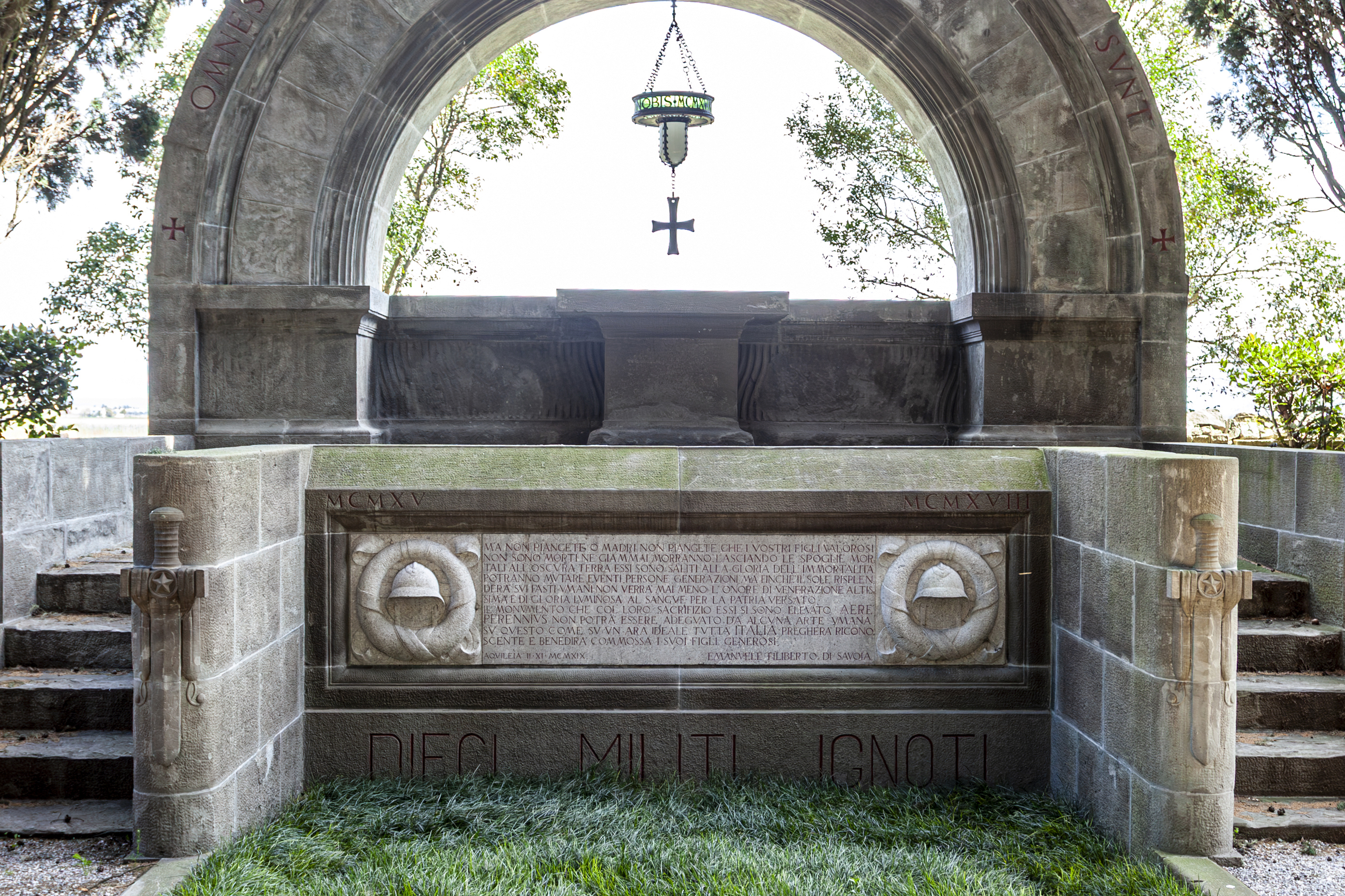 Ogni croce è ornata da un intreccio di fronde di lauro e quercia che circonda un disco bronzeo con il nome, il reparto e la frase “Dulce et decorum est pro Patria mori”. Sculture, cippi e monumenti funebri di ufficiali comandanti sono sparsi attorno al sarcofago dei Militi Ignoti. Ai piedi, la tomba di Maria Bergamas, la donna che scelse il corpo del soldato, reca quale epigrafe quattro parole spoglie: “per tutte le madri”.