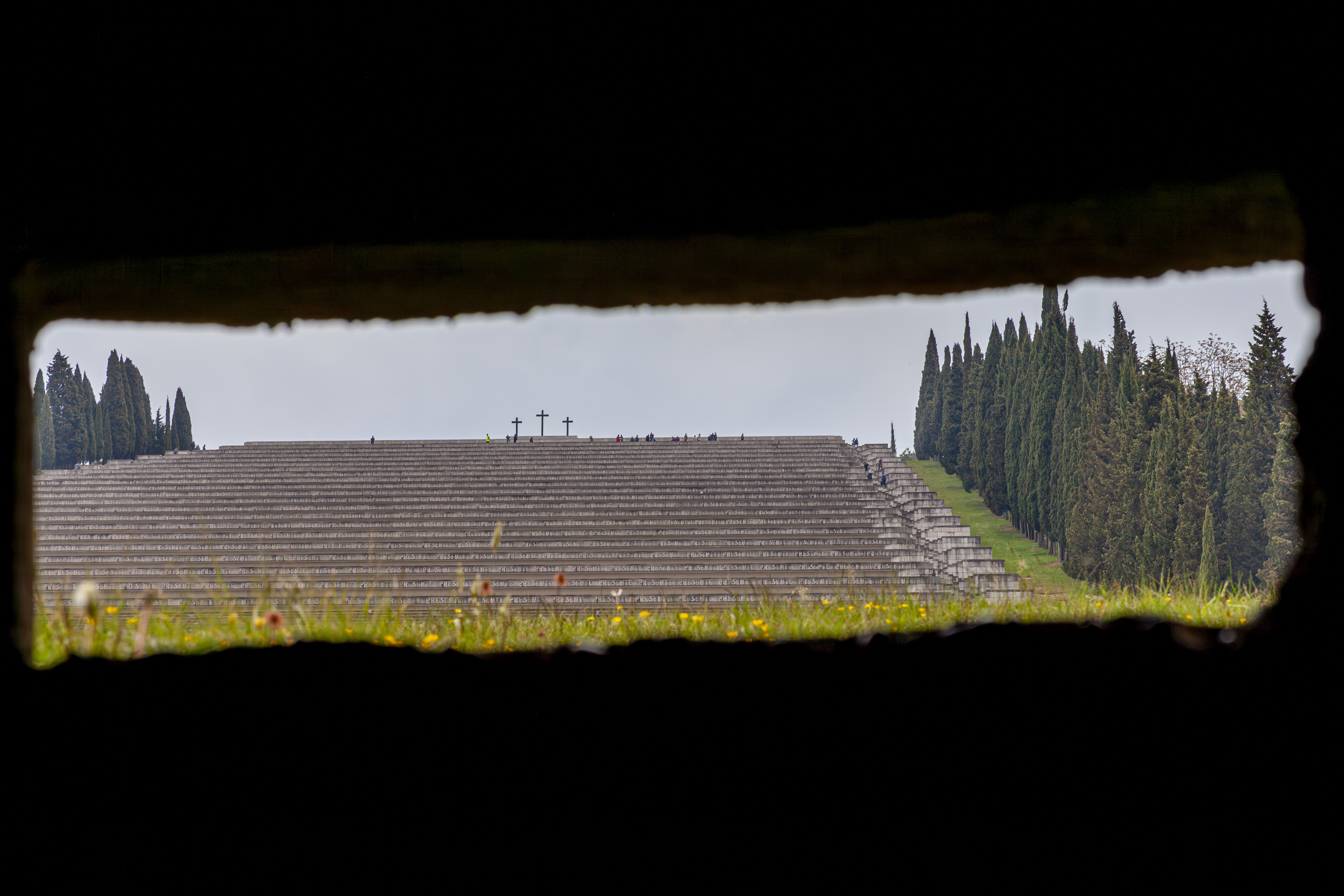 La cima del Monte San Michele è lì dietro, un chilometro appena, e ci puoi salire in motocicletta lungo la Via Sacra, ma è meglio farla a piedi quella strada, sul versante orientale, passando dalla chiesetta diruta, dal valloncello dell’albero morto e dal cippo degli Honved, prima di arrivare alle trincee e alla cannoniera.