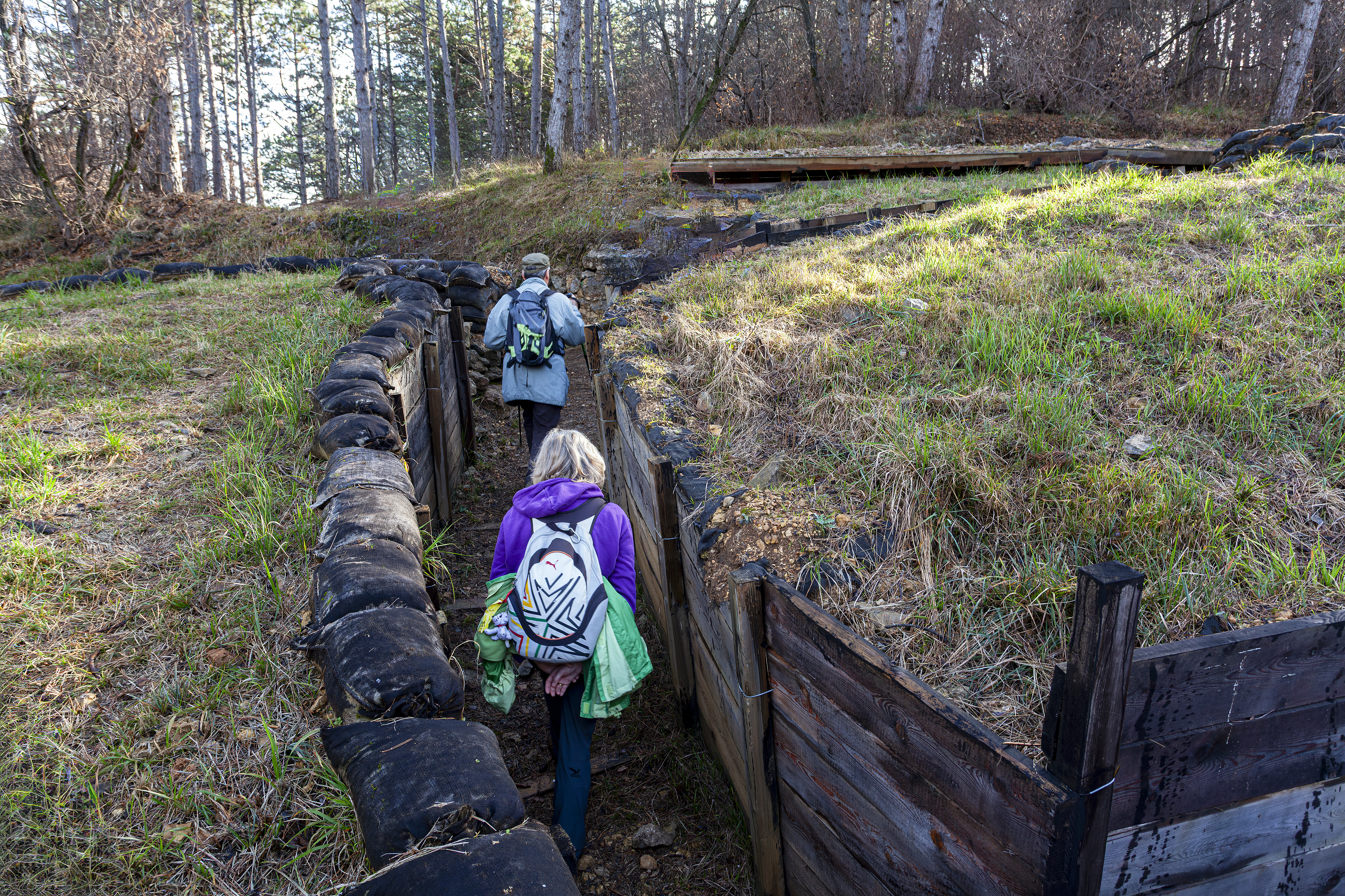 Un vecchio cartello giallo, fiorito di ruggine, segnala i resti della trincea affogati nella macchia. Il tono è perentorio, quasi un’intimazione e ce n’è motivo perché qui, forse più che altrove, le pietre potrebbero raccontare l’orrore. Se lasci loro un po’ di tempo, potrebbero mostrarti i cavalli di Frisia austriaci – che oggi non ci sono più – contorti, frantumati in più punti dalle artiglierie e le lugubri figure di uomini, uno sull’altro, impigliate nel filo spinato che cercavano di varcare. Potrebbero guidarti incontro a gruppi di uomini accatastati disordinatamente, la baionetta in canna ancora puntata verso l`obbiettivo della corsa. Potresti non reggere la vista di quelli sfracellati dalle bombe a mano, senza più testa, o col torace infranto o di quelli raggomitolati dietro un mucchietto di sassi, che avevano raggruppato con la mano per far da riparo.