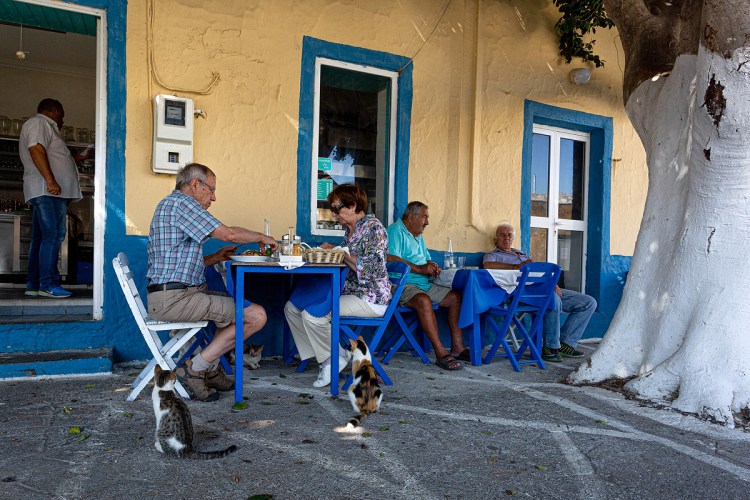 Di ritorno a Kattavía, fra le taverne della piazzetta ci facciamo tentare da quella che esibisce il bianco e il blu nazionali più sgargianti e pranziamo sotto un fico in compagnia di uno sciame di gatti che non perdono un movimento della forchetta dal piatto alla bocca.