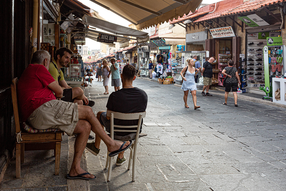 Una Toyota Yaris noleggiata all’aeroporto ci porta a Lindos, storico borgo di marinai ai piedi di una formidabile acropoli che molti raggiungono in groppa a poveri somarelli. La cascata di case bianche nasconde preziose facciate in pietra porosa istoriata di fasce decorative, simboli paleocristiani e motivi orientaleggianti. Sono le case dei capitani che gestivano con le loro navi il traffico di merci tra Venezia, Istanbul e la Palestina. Per il resto, le viuzze nel loro insieme sono un grande centro commerciale che propone ai turisti souvenir seriali e talvolta inveromili. C’è tempo anche per bagnarsi nella piccola e rinserrata baia di Ágios Pávlos.