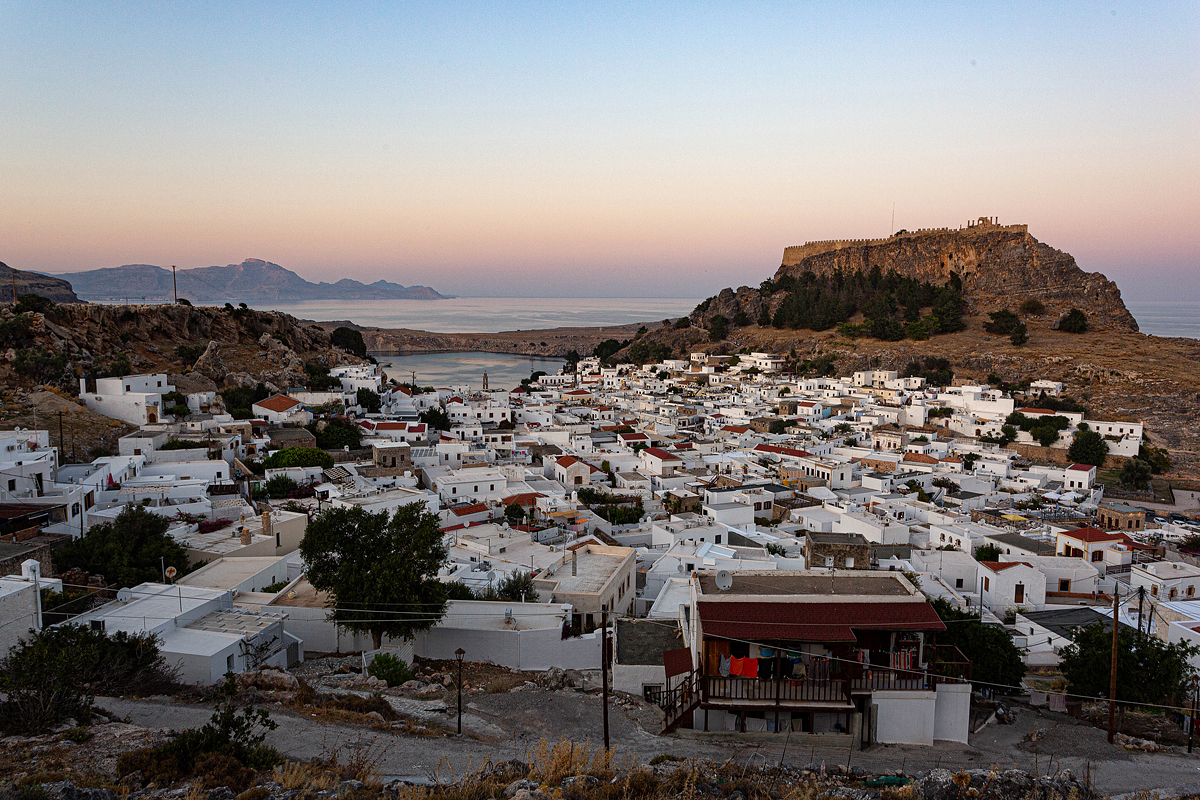 Una Toyota Yaris noleggiata all’aeroporto ci porta a Lindos, storico borgo di marinai ai piedi di una formidabile acropoli che molti raggiungono in groppa a poveri somarelli. La cascata di case bianche nasconde preziose facciate in pietra porosa istoriata di fasce decorative, simboli paleocristiani e motivi orientaleggianti. Sono le case dei capitani che gestivano con le loro navi il traffico di merci tra Venezia, Istanbul e la Palestina. Per il resto, le viuzze nel loro insieme sono un grande centro commerciale che propone ai turisti souvenir seriali e talvolta inveromili. C’è tempo anche per bagnarsi nella piccola e rinserrata baia di Ágios Pávlos.