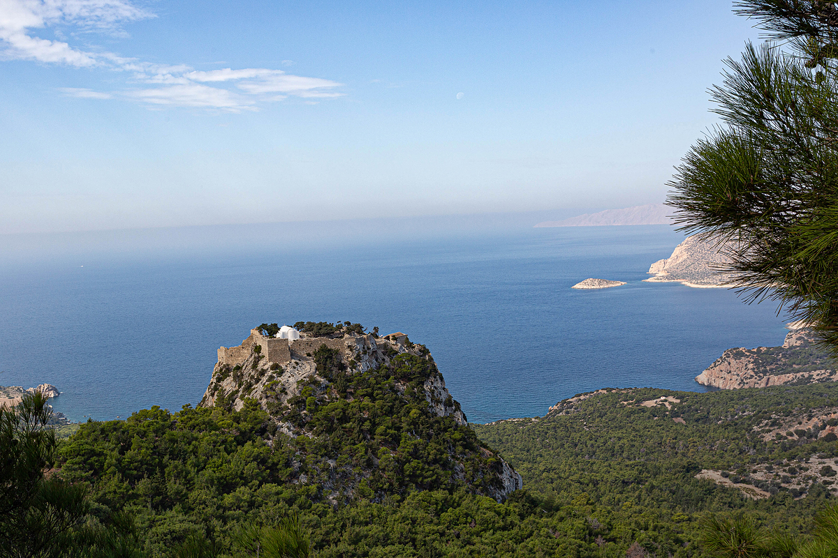 La Toyota Yaris ci serve anche per un’escursione intorno al Monte Attávyros fino a Monólithos con i suoi sparuti resti di fortezza bizantina e la candida chiesetta di Ágios Pandélimon.