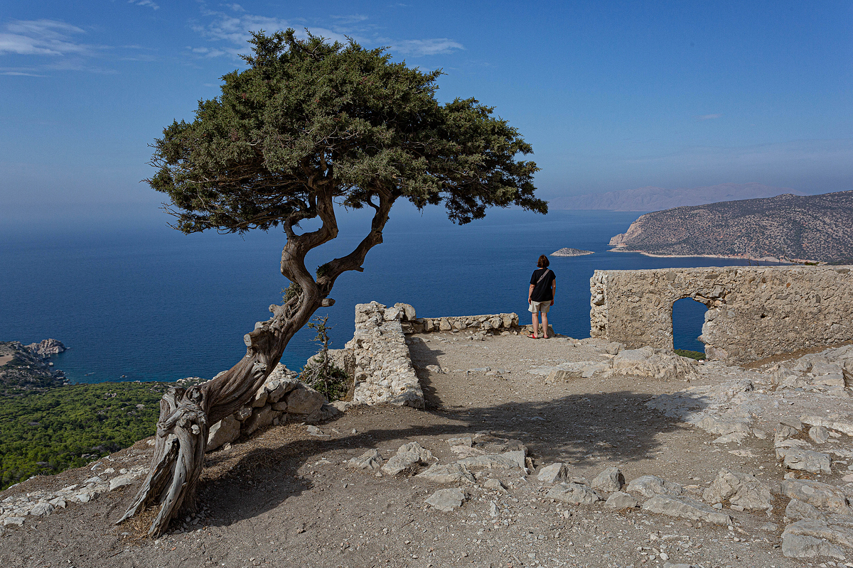 Sulla terrazza spruzzata di rocce corrose, negli occhi il mare blu che si allunga verso Creta e un pino marittimo bistrattato dal vento, la mente si spegne.