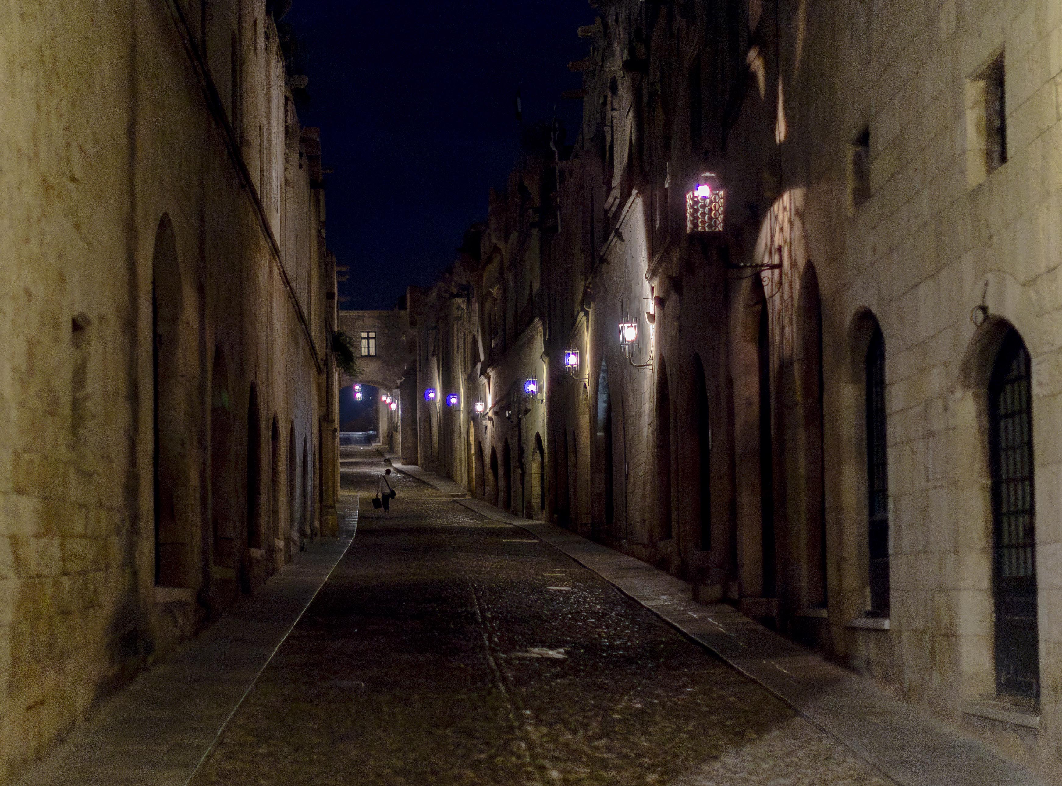La notte indugiamo in Odos Ippoton, la via dei Cavalieri, misteriosa e desolata nell’oscurità. Lì è rimasta intatta la pietra degli alberghi dell’Ordine, in un’atmosfera sospesa che si coglie meglio la notte, come se l’abbandono della città da parte degli Ospitalieri di San Giovanni fosse appena accaduto. E invece sono passati cinquecento anni da quel primo di gennaio 1523 quando Solimano il Magnifico riuscì ad ottenere la resa dei Cavalieri.