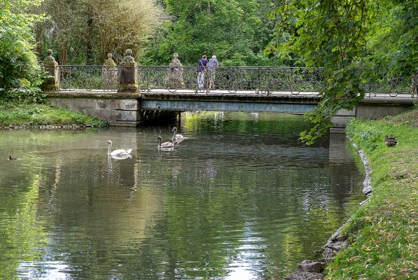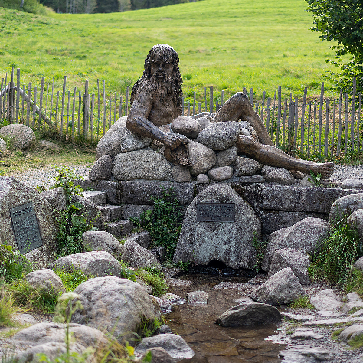 Ai piedi di un grande prato smeraldino, in un folto d’alberi, un filo d’acqua zampilla dal terreno e scende pigramente a valle. La fonte è sormontata da un dio pagano in bronzo dai lunghi capelli e con barba fluente, sdraiato fra grossi sassi. Le persone si muovono intorno con deferenza come se fossero in un luogo speciale, esposte a qualcosa di numinoso che si manifesta nel getto d’acqua limpida.