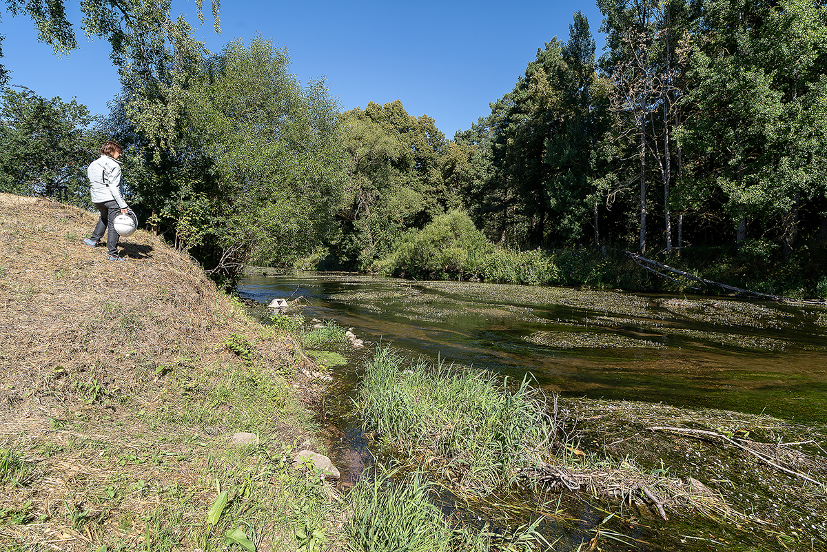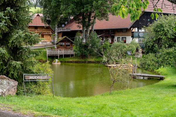 La fonte si trova nei pressi della fattoria “Hirzbauernhof”, poco sotto lo spartiacque europeo. Quando arriviamo, ci accoglie una zattera da ragazzini con la bandiera nera dei pirati ormeggiata nel laghetto da cui nasce il fiume. Tuttavia, del fiume non c’è traccia, tanto che dubitiamo di essere nel luogo giusto finché un cartello pirografato ci rassicura. Esplorando il terreno intorno, scopriremo presto che corre interrato per qualche centinaio di metri e poi riaffiora in una linea sinuosa fra i cespugli che ne segnano il percorso fra i prati in discesa.