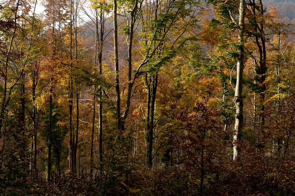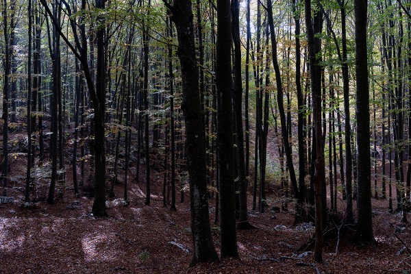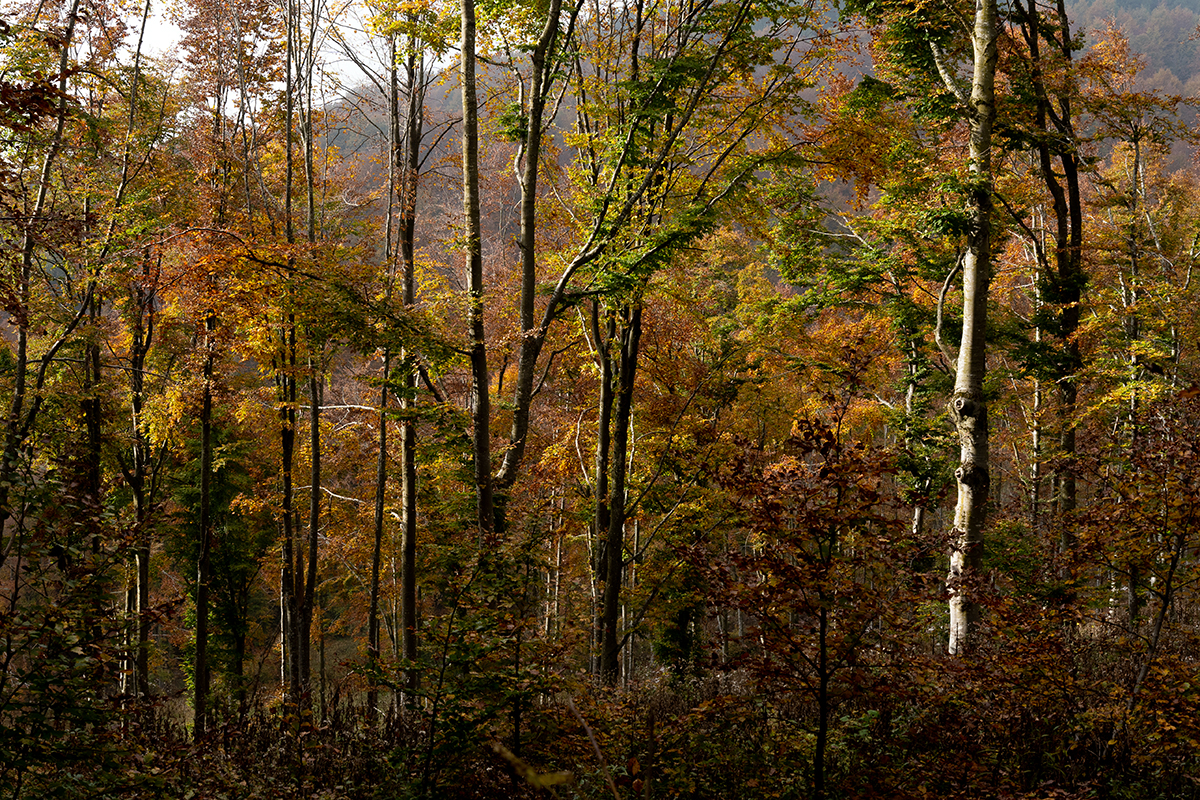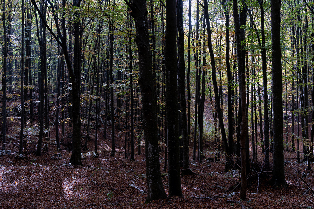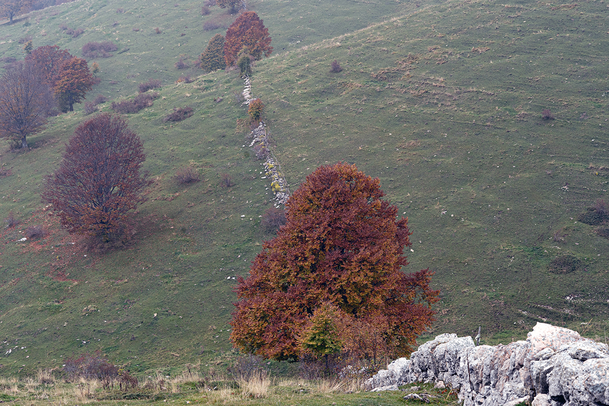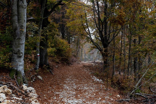 Il sentiero si inoltra nella faggeta e scende lungamente fino a una radura dove lo si abbandona verso destra all’indicazione per il Rifugio Lausen.